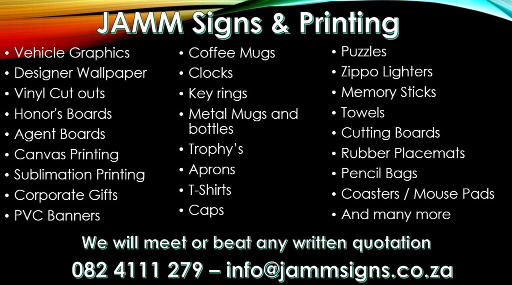 As your dedicated printing partner, we strive to provide reliable service and timely deliveries. With a wide variety of products, including PVC banners and promotional items like mugs and caps, JAMM Signs & Printing is here to support your success.
